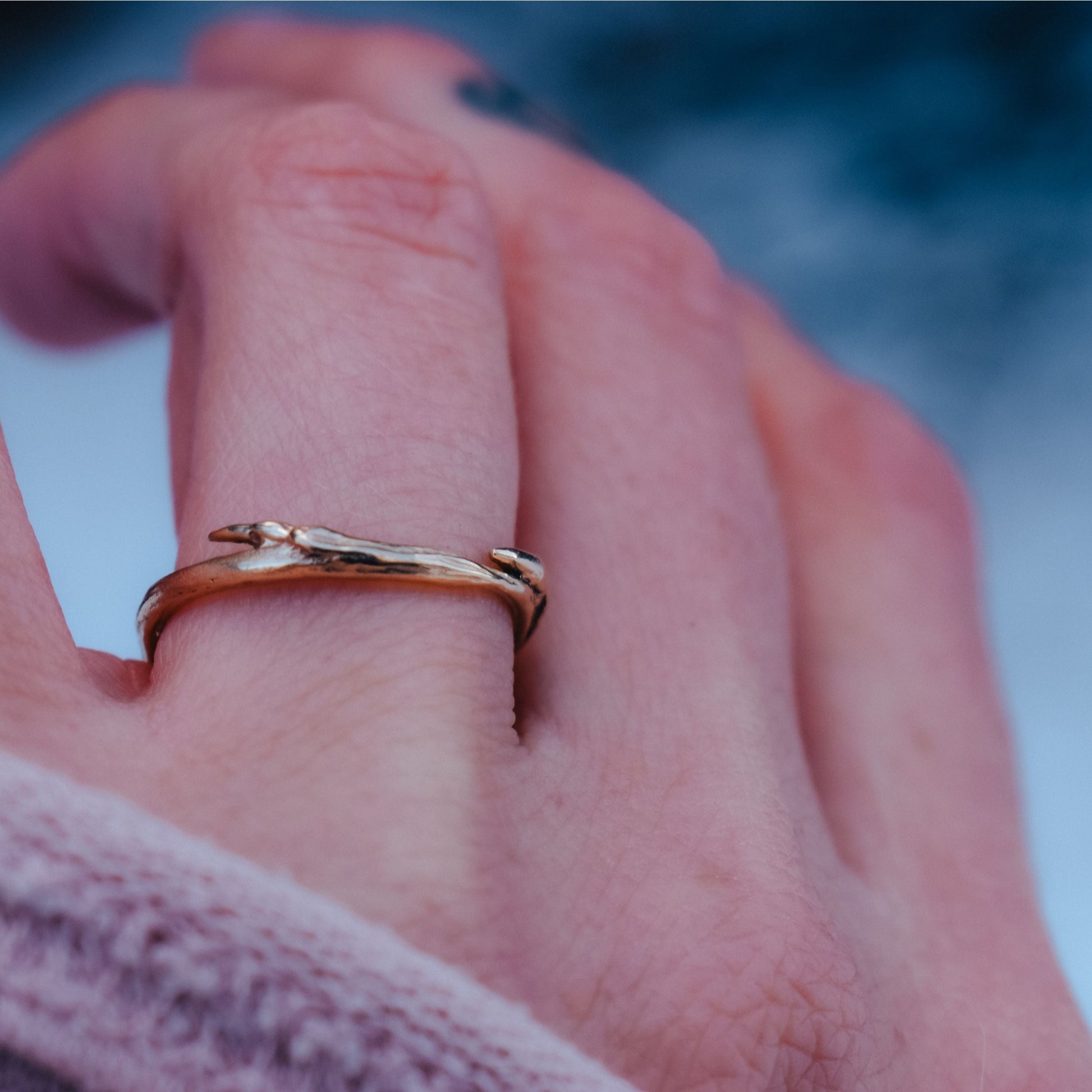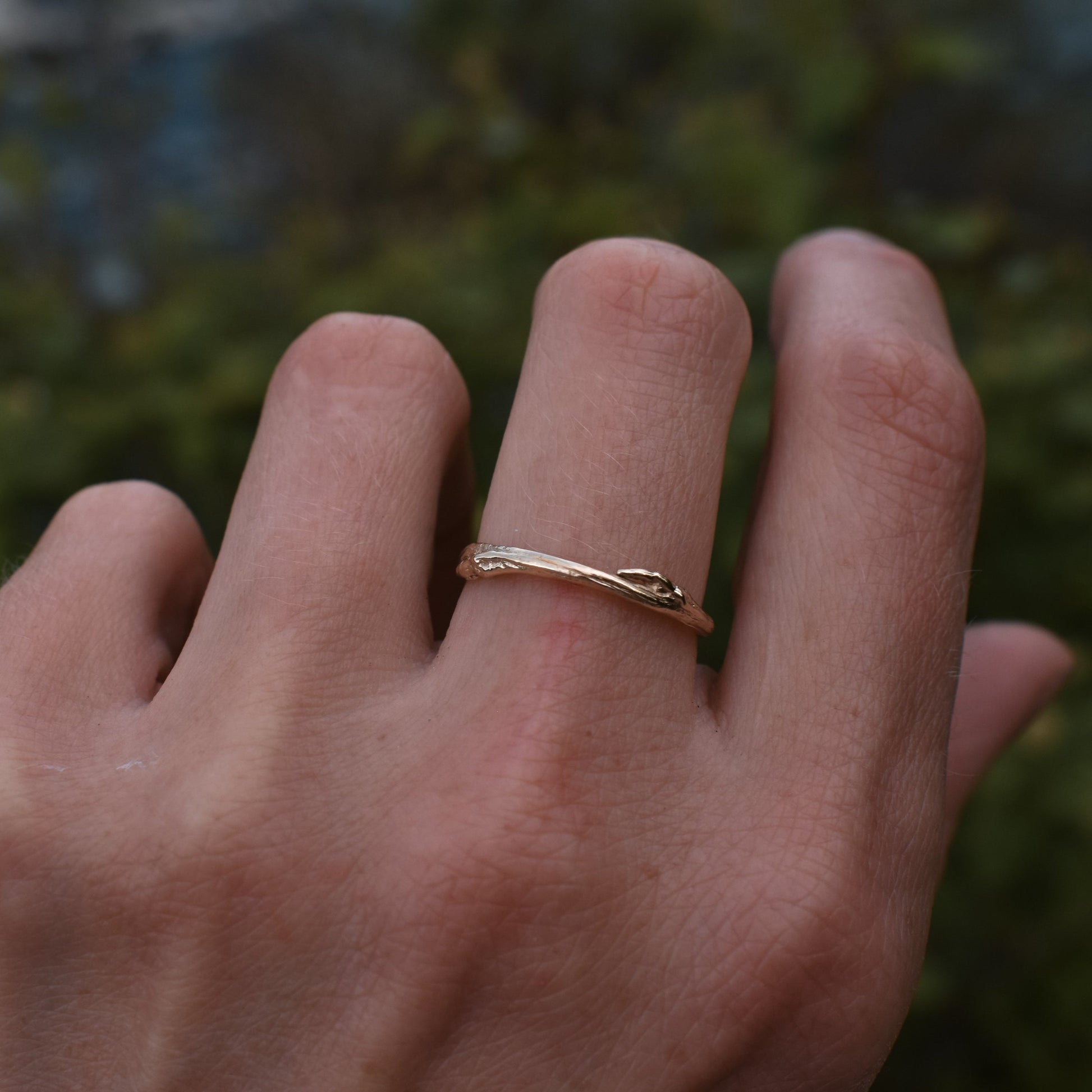 An organic aspen twig, sustainably harvested from the north shore of Lake Superior, cast into recycled 14 karat gold, and finished by hand. This ethically handcrafted ring band celebrates the symbolism of the sturdy aspen tree, embodying love, commitment, endurance, and growth.
