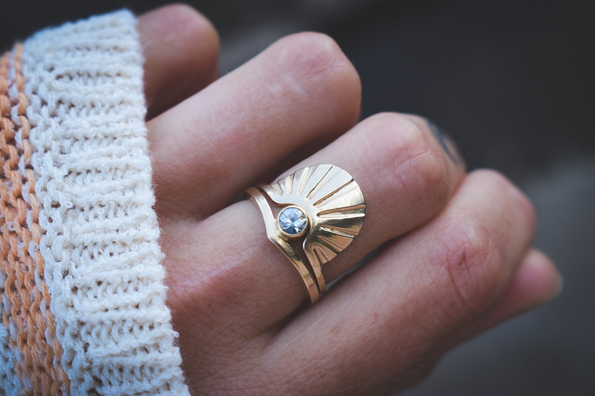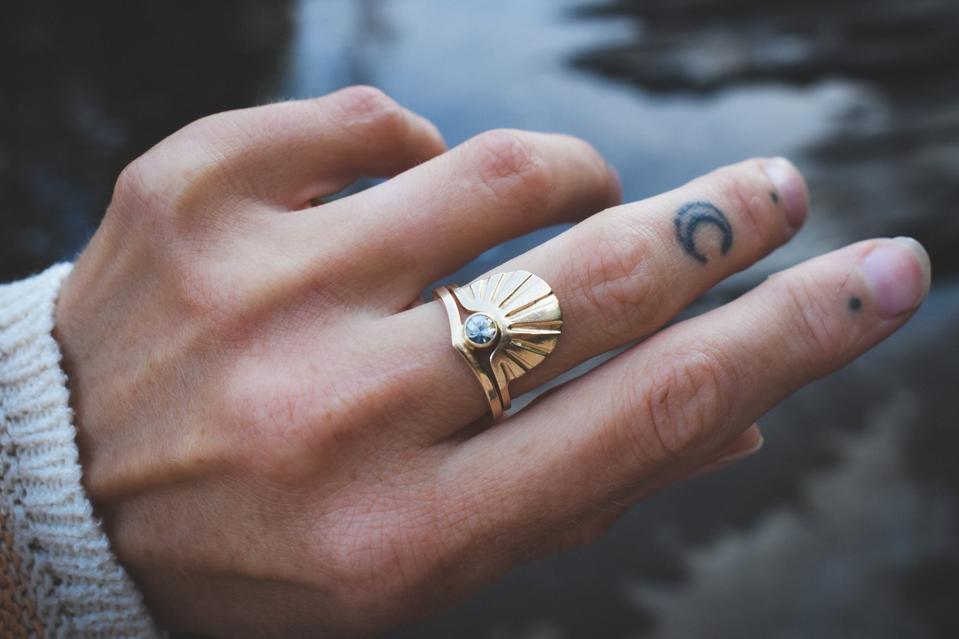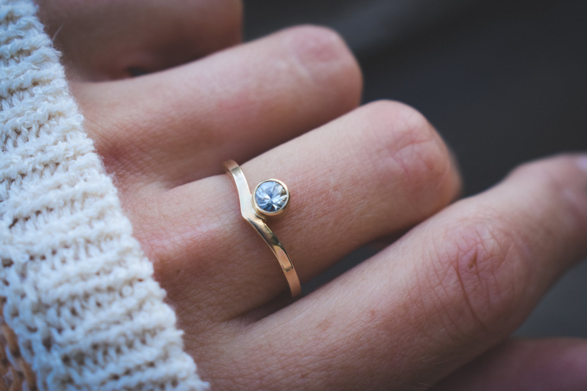 The sweetest, most understated ring. Dainty yet very solid construction, this ring is entirely hand fabricated using recycled 14 karat yellow gold, forged into a gentle curve, and set with a briliiant white Montana sapphire in VVS clarity with exceptional sparkle. This stone was hand-mined from the Eldorado Bar of the Missouri river just outside of Helena, Montana. A strong yet subtle design all on its own, that can be worn with the stone above or below, she also pairs perfectly with the Aurora Ring Crown. Feel free to reach out if you'd like to customize this ring: Make it Bespoke. Fits size 6 and can be resized within two full ring sizes at no charge, simply send us an email after placing your order or leave a note at checkout.