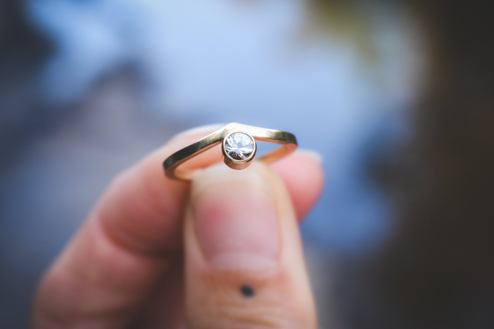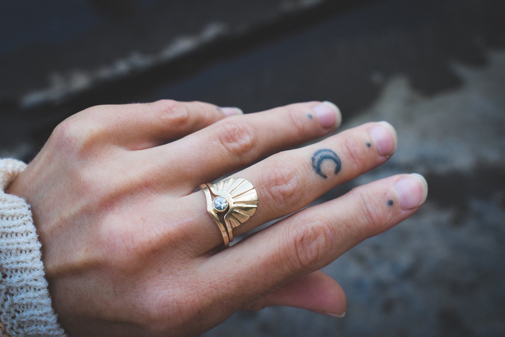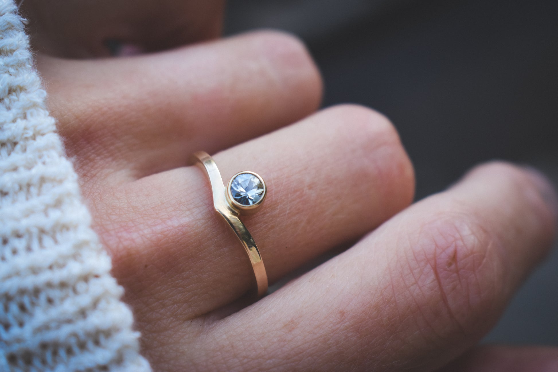 The sweetest, most understated ring. Dainty yet very solid construction, this ring is entirely hand fabricated using recycled 14 karat yellow gold, forged into a gentle curve, and set with a briliiant white Montana sapphire in VVS clarity with exceptional sparkle. This stone was hand-mined from the Eldorado Bar of the Missouri river just outside of Helena, Montana. A strong yet subtle design all on its own, that can be worn with the stone above or below, she also pairs perfectly with the Aurora Ring Crown. Feel free to reach out if you'd like to customize this ring: Make it Bespoke. Fits size 6 and can be resized within two full ring sizes at no charge, simply send us an email after placing your order or leave a note at checkout.